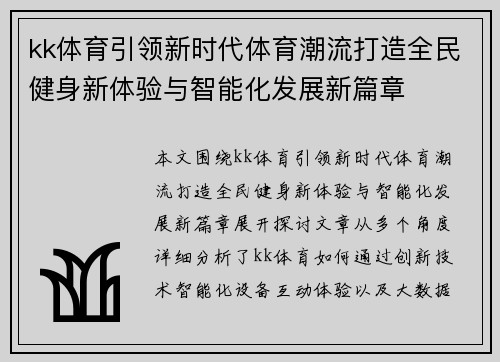 本文围绕“kk体育引领新时代体育潮流,打造全民健身新体验与智能化发展新篇章”展开探讨。文章从多个角度详细分析了kk体育如何通过创新技术、智能化设备、互动体验以及大数据分析等手段,引领体育行业的发展潮流,并为全民健身注入新活力。同时,文章探讨了体育科技在改善健身体验和提升运动效率方面的作用。通过智能化的体育平台,kk体育不仅提供了便捷的健身方式,更推动了社会全民健身文化的蓬勃发展。本文将从四个主要方面分析这一主题,详细阐述其对新时代体育和智能化发展的推动作用。